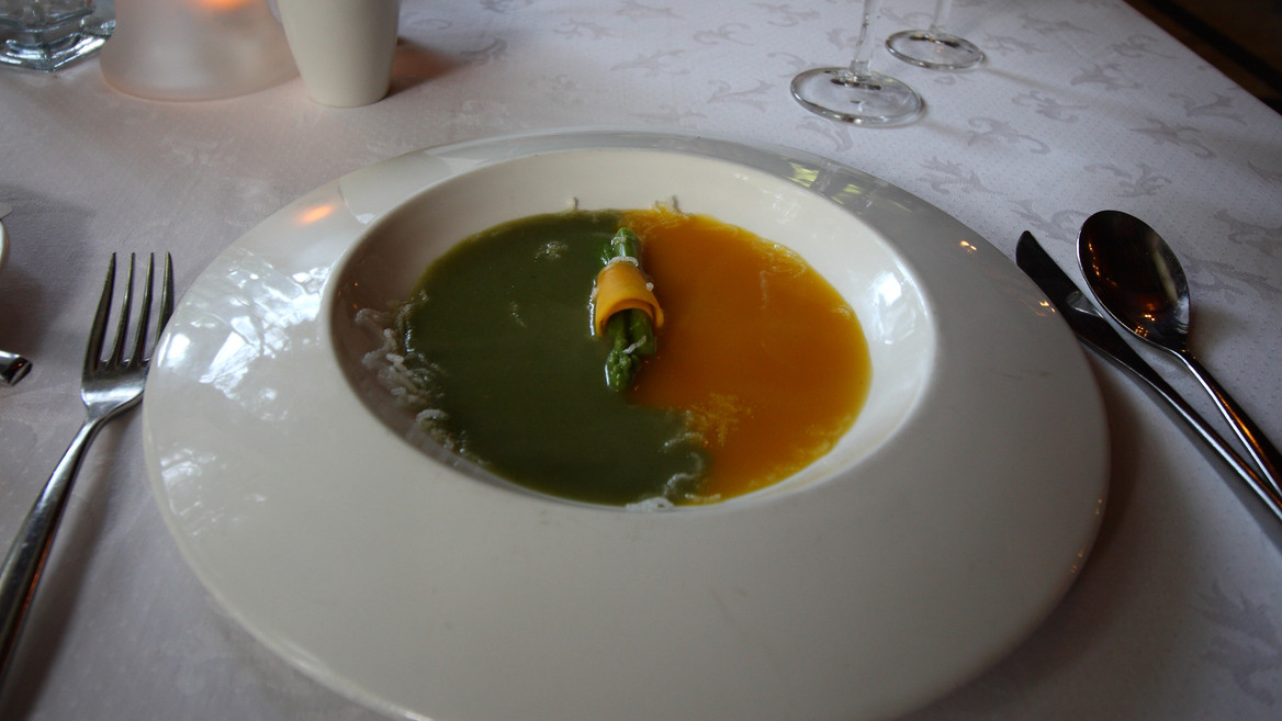 - Kürbis und Spargelsüppchen, vom Ober am Tisch in den Teller gegossen, daher noch 2farbig