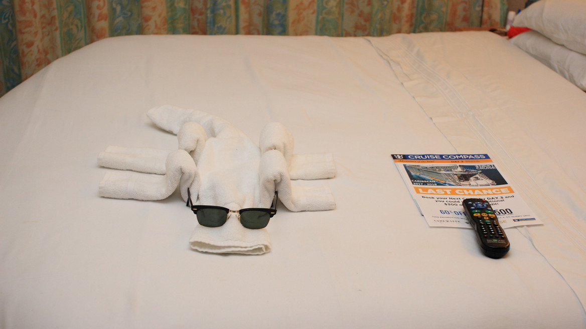 17.33 ein schöner Tag auf St. Maarten geht zu Ende und in unserer Kabine werden wir von einem Krokodil empfangen.